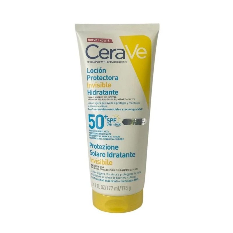 Cerave loción protectora invisible hidratante spf50+ es un protector solar facial y corporal de muy alta protección que ayuda a proteger la piel frente a los rayos uvb y uva. Su fórmula ligera e invisible hidrata, refuerza la barrera cutánea y no deja residuos blancos. Ha sido desarrollada con dermatólogos y es apta para piel sensible, tanto en niños como en adultos.